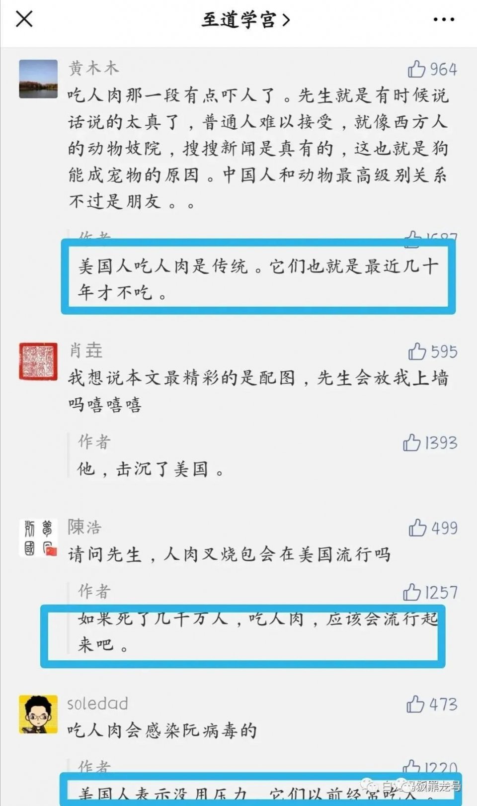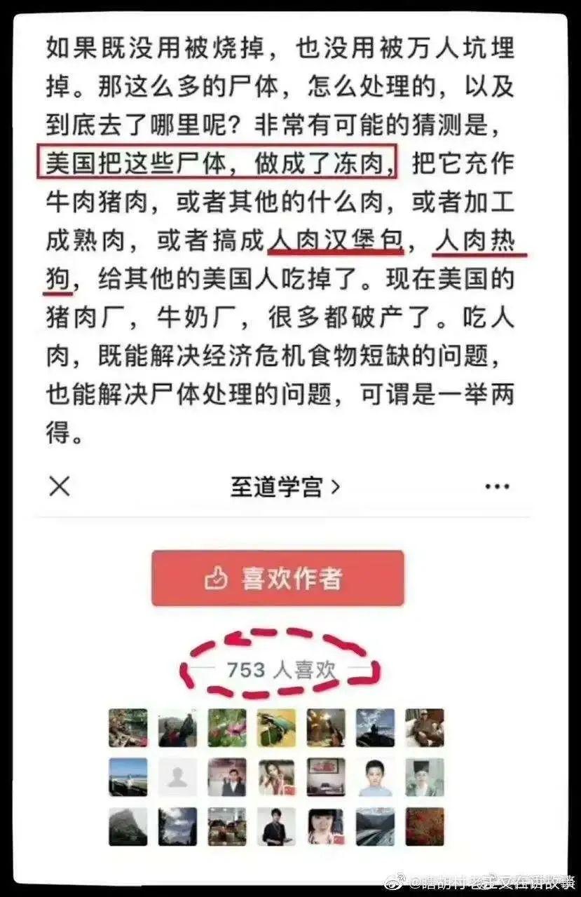 至道学宫“这个垃圾公号据说拥有上百万粉丝,商业价值上千万,它的商业价值是靠一大批脑残粉的智商税堆起来的!”他批评那篇编造美国人把尸体做成汉堡的“烂文”,“这类反人类的谣言居然阅读量超百万,打赏数万元,人性之愚之残之恶,可见一斑!”