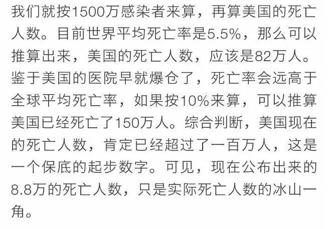 最震惊的是,还有的说美国人要死170万,死220万,甚至全美感染者要突破2亿人....