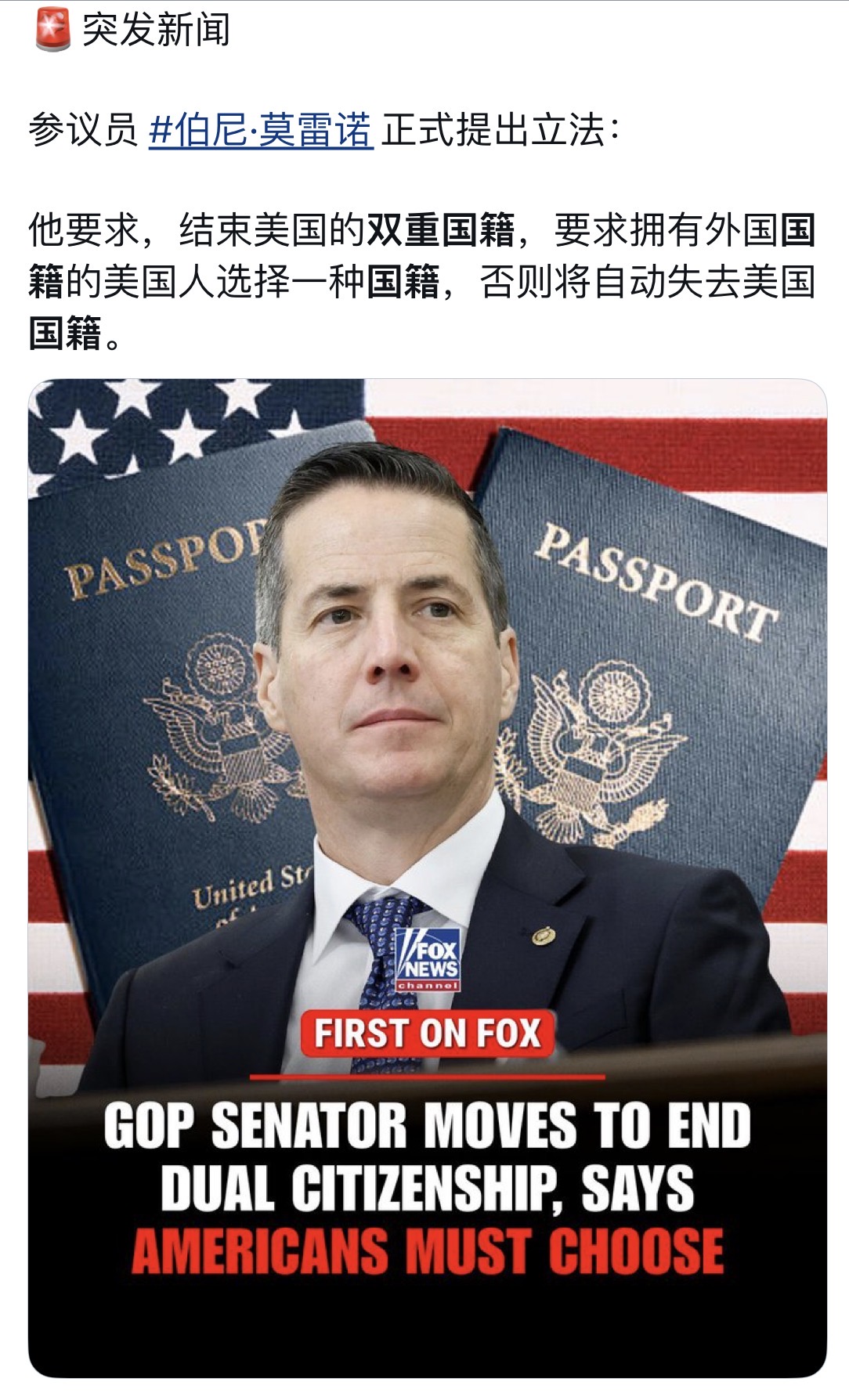 美国参议院提议取消美国公民的双重国籍。美国之倒退程度直逼中国,速度却比光还快。川普2.0 不到一年,美国变成一个准纳粹国家了快